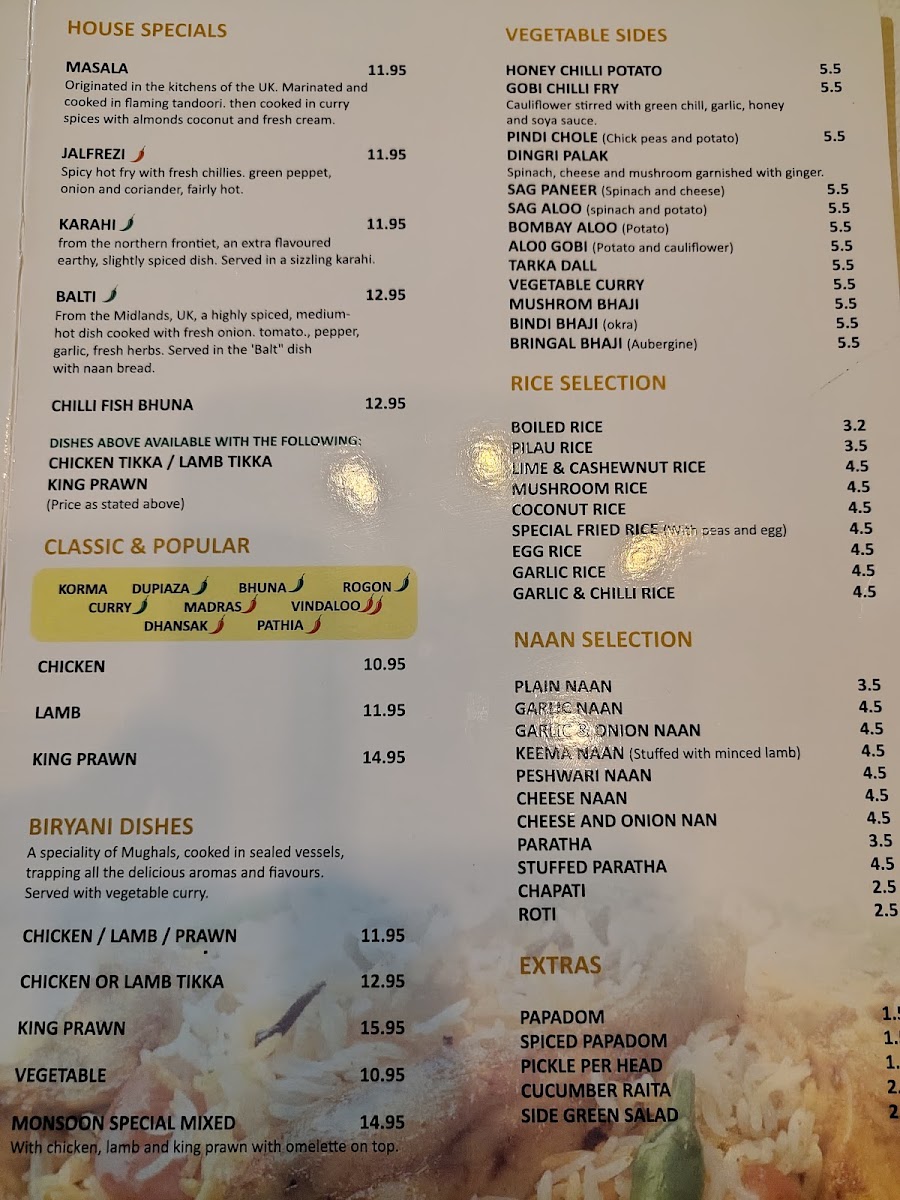 Highlights like Chicken Jalfrezi and Chicken Korma paired with freshly baked naan provide satisfying options that complement the warm and inviting atmosphere of the restaurant. The menu includes a balanced mix of hearty mains and lighter dishes, making it easy to find something for both a comforting solo meal or a shared experience with friends and family.